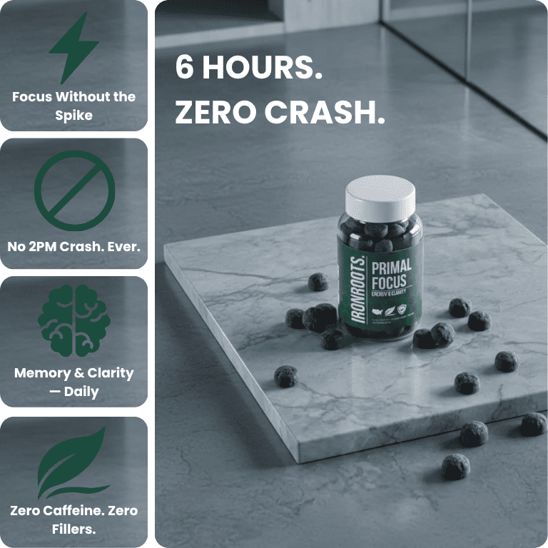 Coffee relies on caffeine for stimulation. IRONROOTS products are formulated to support sustained clarity and focus without crashes or jitters.