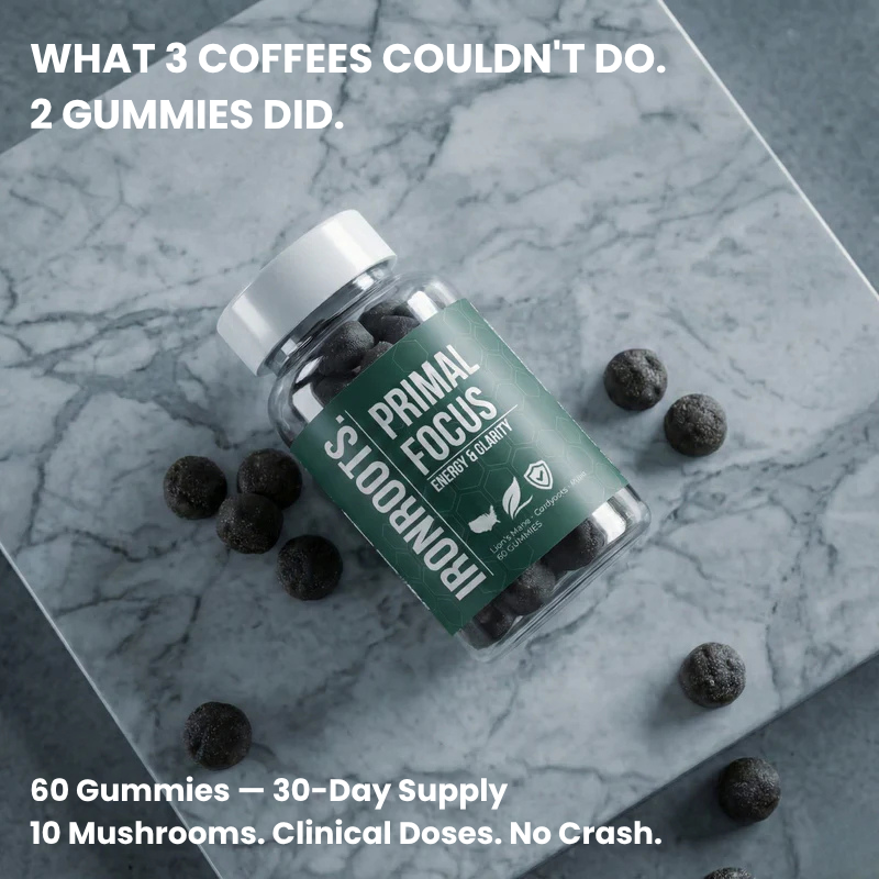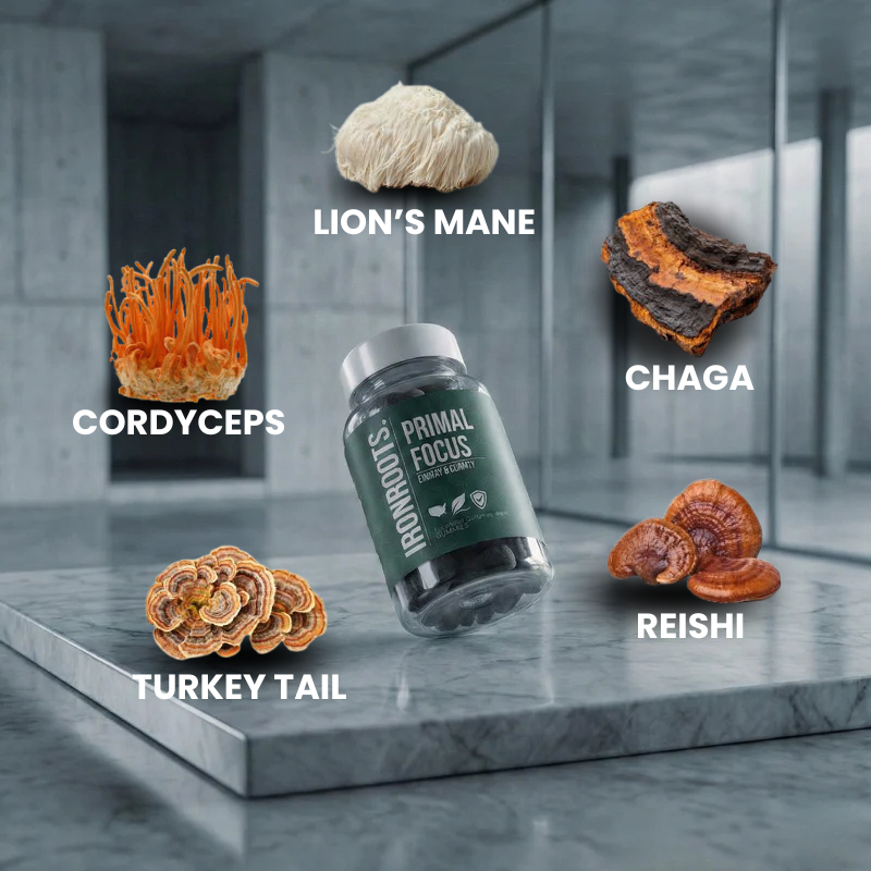 IRONROOTS™ Primal Focus was built to change that. Ten functional mushrooms — each one selected for a specific, documented role in cognitive performance — work together to stabilize your nervous system, eliminate brain fog, and deliver the kind of focus that doesn't quit at 2PM.